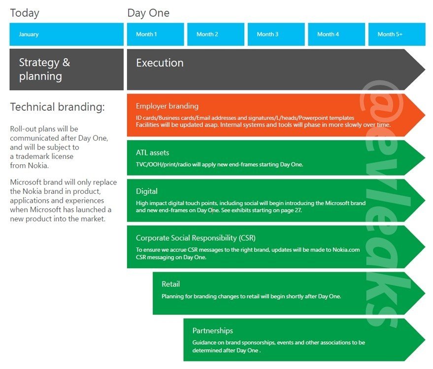 Microsoft però sembra molto seria nel liberarsi del brand Lumia non appena verrà lanciato il suo personale Windows Phone, come mostato dalle immgini inviate a @evleaks. Da quanto potete vedere, nella strategia di transizione inviata ai dipendenti Nokia, viene affermato che “Il brand di Microsoft rimpiazzerà il brand di Nokia nei prodotti, nelle applicazioni e nelle esperienze quando Microsoft avrà lanciato un nuovo prodotto sul mercato.”